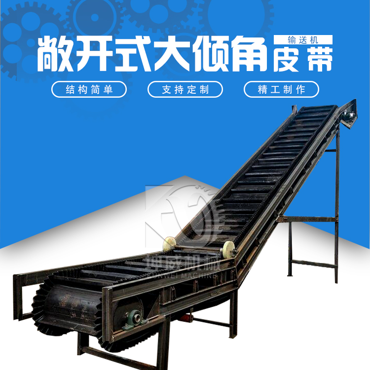 3、大傾角皮帶機非常適合輸送散狀物料,輸送角度能夠大傾角調(diào)節(jié),能夠達(dá)到普通、花紋式輸送機所不能達(dá)到的輸送角度。